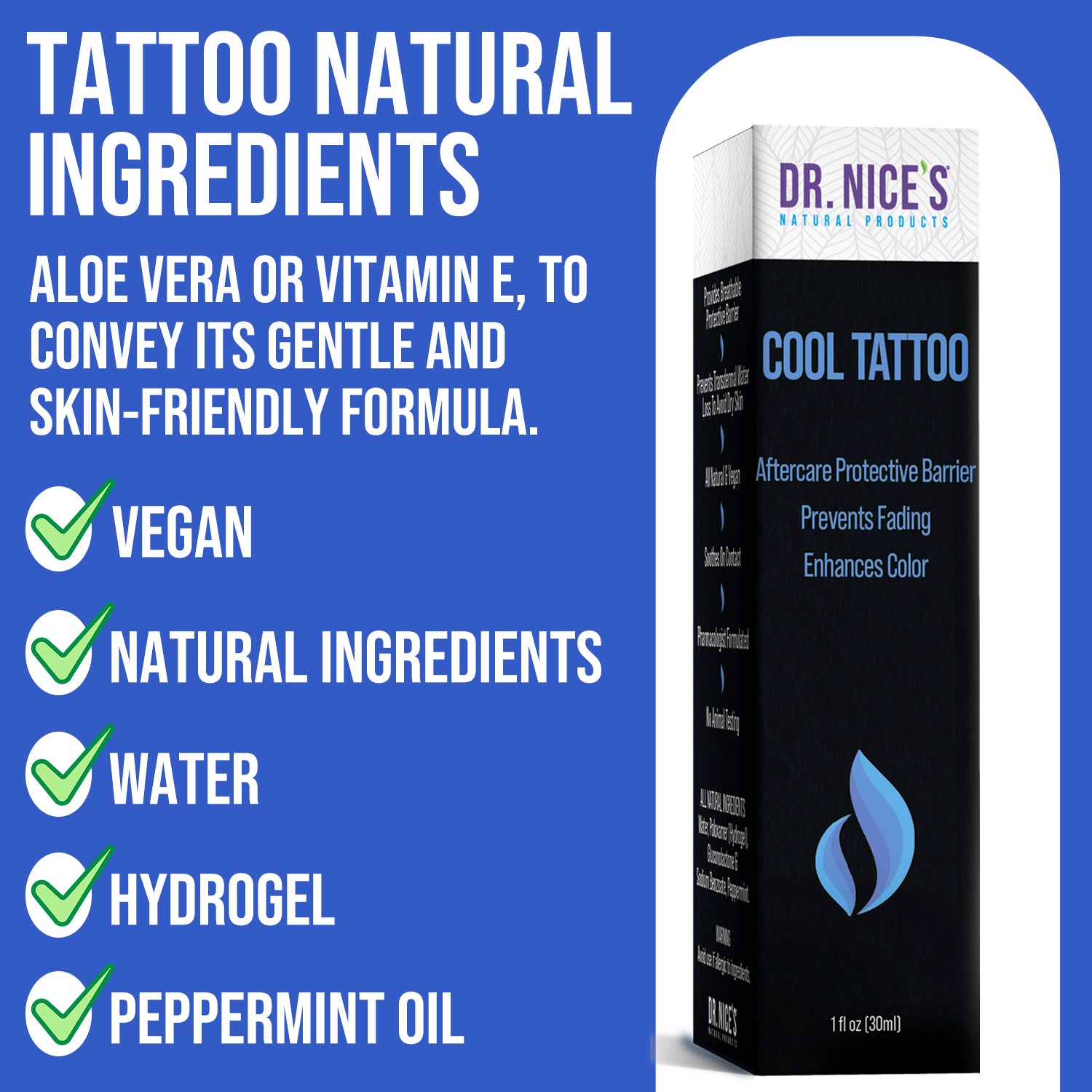 Description: Dr. Nice Natural Products presents a revolutionary tattoo aftercare solution that not only provides instant relief but also ensures the longevity and vibrancy of your new tattoo. Our unique hydrogel formula is designed to cool and soothe your skin immediately upon application, making the healing process more comfortable and less stressful.